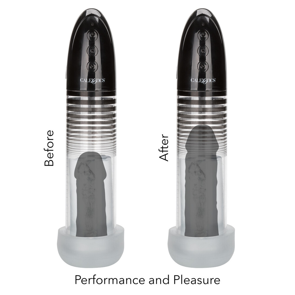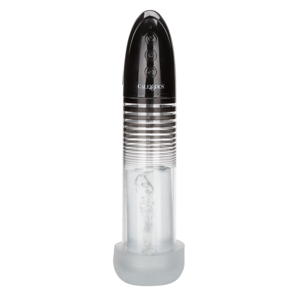 Advanced USB rechargeable penis pump with smart built in controls and multiple enhancement modes. Features firm design, 7 to 8 inch insertable length, and phthalate free materials.